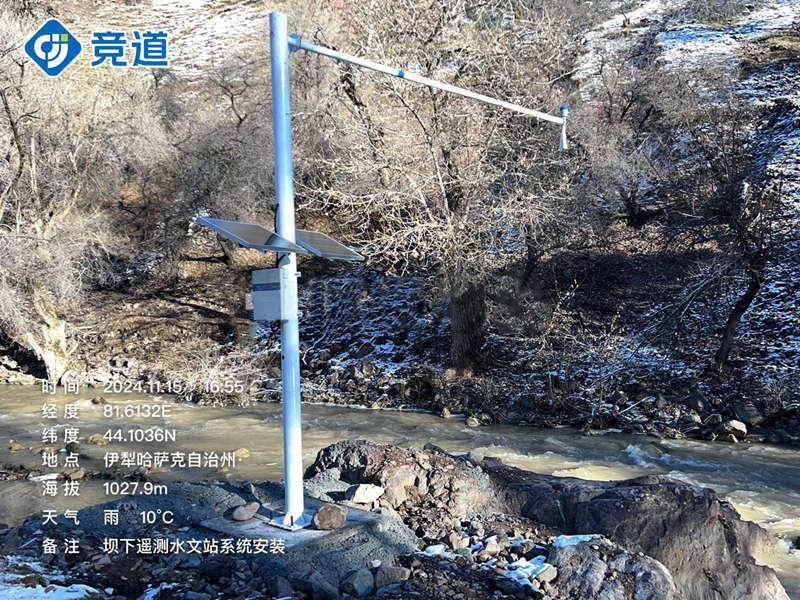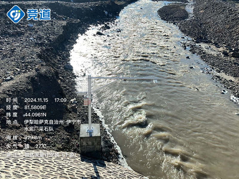 近期我公司山東競道光電的水文流量站在伊犁地區完成安裝。水文流量站明渠流量計主要由雷達流速計、雷達水位計組成,流速計用于采集流體表面流速,并經過模型計算得到過水斷面平均流速,再結合水位計測得的水位以及斷面信息算出過流斷面面積,從而利用公式流量=平均流速×過流斷面面積×修正系數得到流量,其中修正系數是根據實際測量環境得到的標準值進行計算得到。