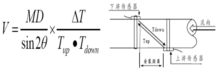 當(dāng)超聲波束在液體中傳播時(shí),液體的流動(dòng)將使傳播時(shí)間產(chǎn)生微小變化,并且其傳播時(shí)間的變化正比于液體的流速,其關(guān)系符合下列表達(dá)式: